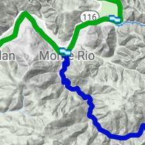 When you select a stream, the course of the stream is highlighted in dark blue on the map. If the selected stream flows into another stream, the course of that other stream is highlighted in green on the map. In the example above, the course of Dutch Bill Creek will be highlighted in dark blue, and the course of the Russian River will be highlighted in green.