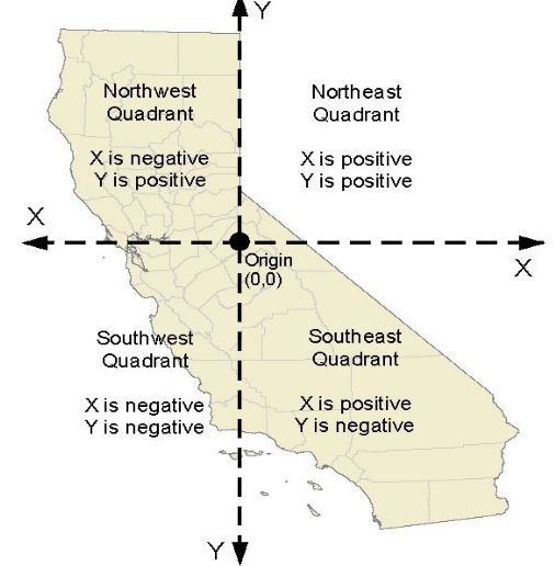 ... California (Teale) Albers is an adaptation of the Albers Conical Equal Area projection as defined by the former State of California Teale Data Center. It is a California-specific projection optimized for area calculations, making it popular to map statewide resources. It may be referred to as "Teale Albers", [or] "California Albers", ... The projection divides California into four quadrants. Coordinate values (units of measure) are in meters from the origin (0,0) near the center of the state.