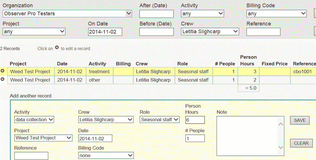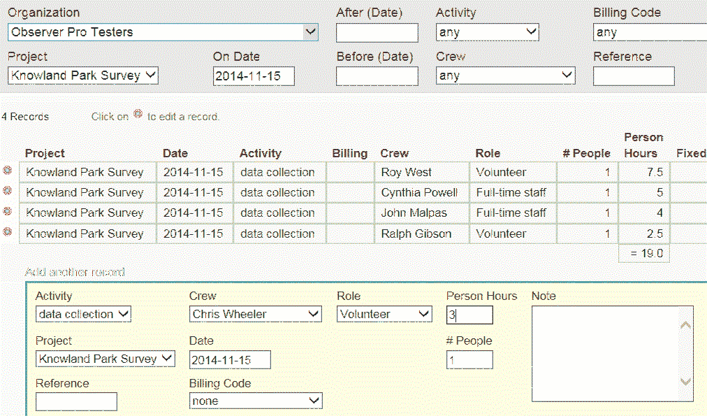 2. Many People, one Activity, one Day, one Project In the data entry session below, the person entering is adding one record to describe each person who did data collection for a single project (Knowland Park Survey) on a single day. | ||||||