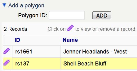 In this case, the user chose "search" as the value of Purpose, so that these polygons will be available for searching from applications such as Observation Search. If you are planning to use the uploaded polygons in observation records, then set Purpose to "assessment", and they will be available from the Plant Observation Entry application. Once you have assigned values, press . |