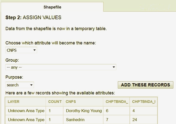 If you upload a shapefile of lines or polygons with this application you will be able to choose a single attribute from the shapefile to become the name of the line or polygon as it resides on Calflora. Other attributes will be ignored. If you have a shapefile with plant observation data in it, and you want to load the observations into your Calflora account, this is not the right application to use. If will be much easier to upload a shapefile of observations into your Calflora account if you use the Observation Upload application instead. |